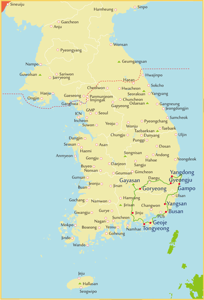 | Day 3 | Gayasan - Jinju - Tongyeong - Geoje - Busan | 270km |